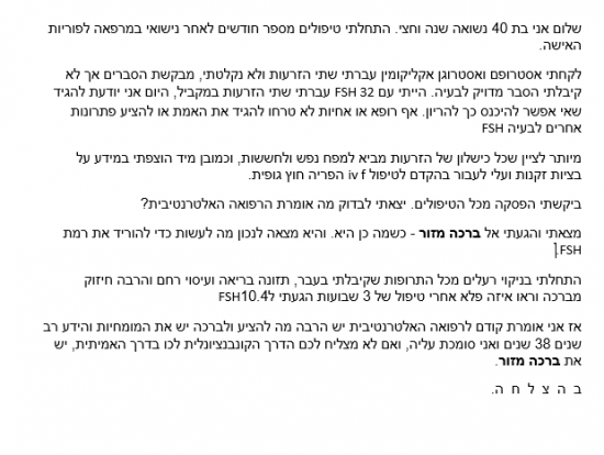 וכבר במפגש הראשון נתנה לי טיפים טיבעיים להורדת ה-fsh הגבוה המעכב הריון שהוריד תוך מספר שבועות מ32 ל14 והמשיך לרדת...